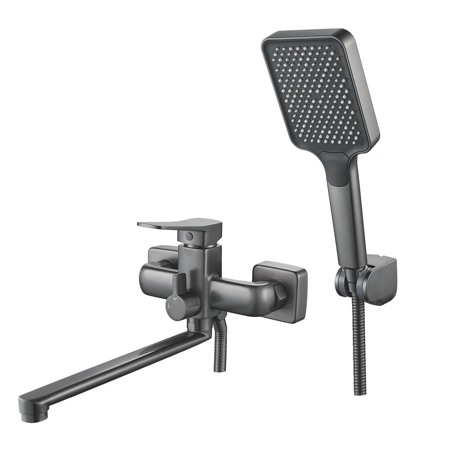 Смеситель оснащён длинным поворотным изливом и двухрежимной душевой лейкой из ABS-пластика. В комплекте поставки эксцентрики, настенный держатель душевой лейки и душевой шланг длиной 150 см. На смеситель предоставляется гарантия 5 лет.