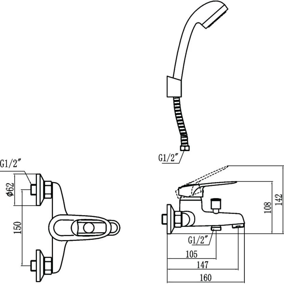 Смеситель, шланг, душевая лейка, держатель душевой лейки, эксцентрики, инструкция |