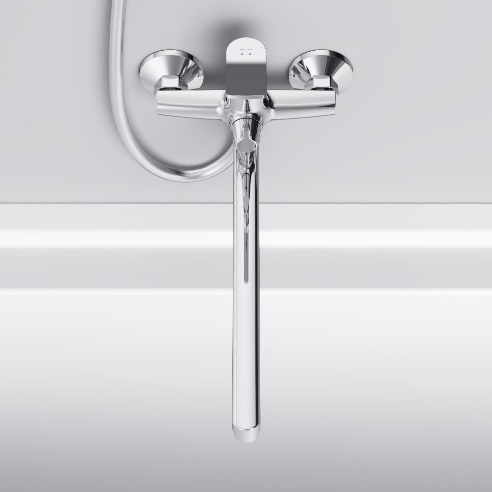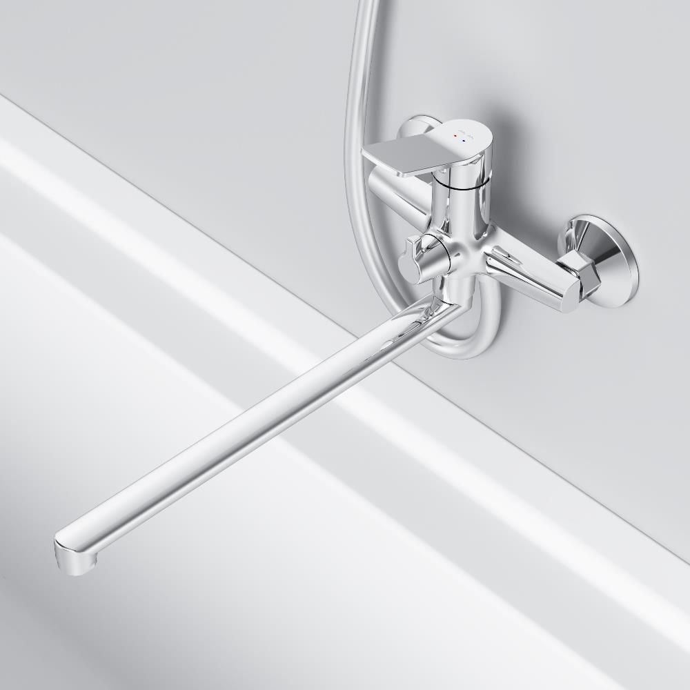 Универсальный длинный излив позволяет использовать смеситель как для ванны так и для рядом стоящей раковины. Поворотный переключатель с излива на ручной душ -максимум комфорта и надежности в использовании.