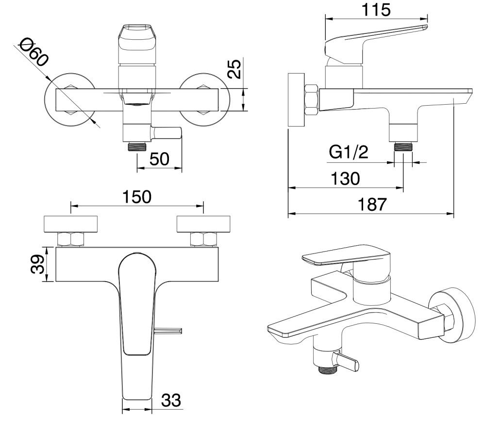 Свойства. Тип: смеситель; Назначение: для ванны с душем; Управление: рычажное; Материал: латунь; Цвет: хром; Область применения: бытовая; Страна: Италия; Механизм: керамический картридж; Монтаж: подвесной; Длина излива, см: 18.7; Стилистика дизайна: современный стиль; Форма излива: традиционная; Выдвижной излив: нет.