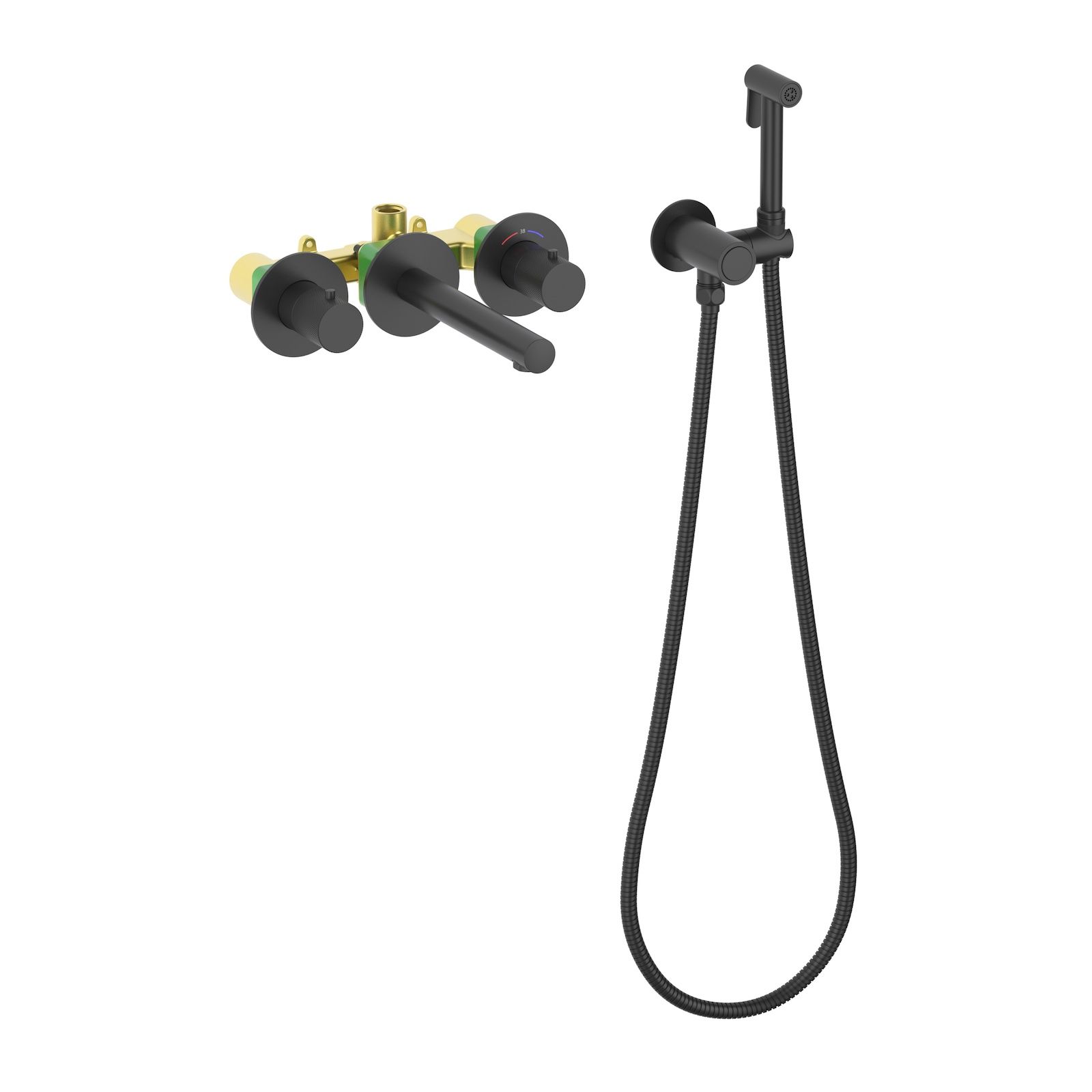 смеситель (наружная часть), внутренняя часть, шланговое подключение с держателем лейки, гигиеническая лейка, шланг, декоративные накладки, инструкция |