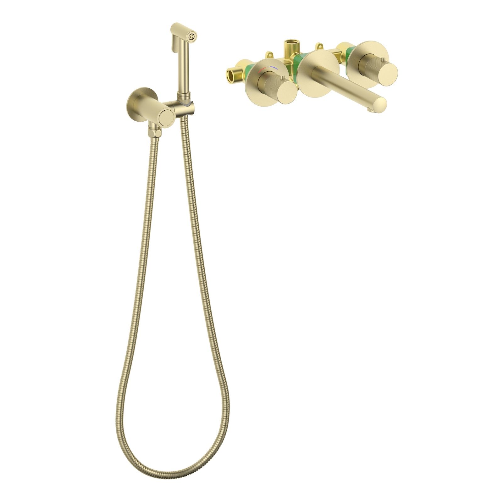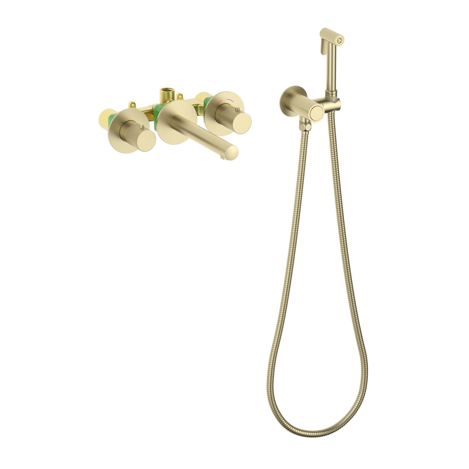 смеситель (наружная часть), внутренняя часть, шланговое подключение с держателем лейки, гигиеническая лейка, шланг, декоративные накладки, инструкция |
