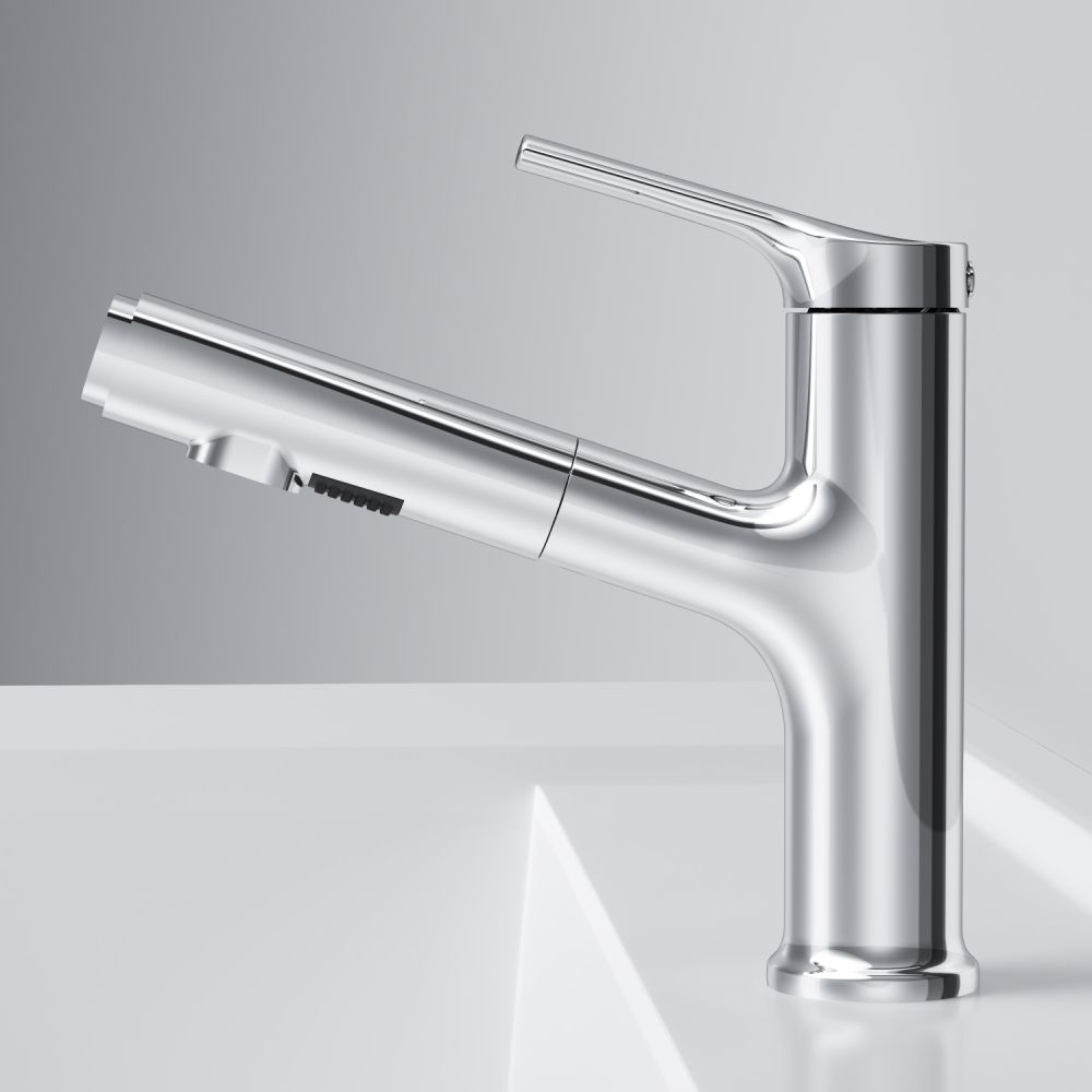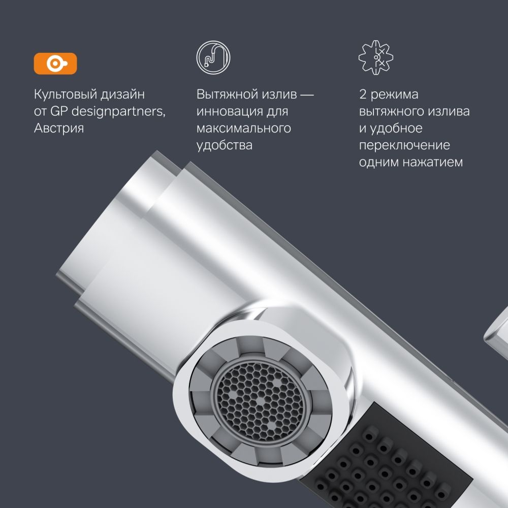 Идеальная геометрия разработанная по стандарту SA (Smart Angle) – математически выверенное соотношение высоты смесителя длины излива и наклона корпуса. Вытяжной излив – инновационная технология для максимального удобства и функциональности. Два режима вытяжного излива и удобное переключение одним нажатием для облегчения решения ежедневных бытовых задач.
