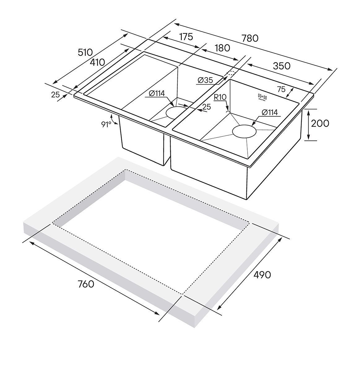 - Размер чаши (ДхШхВ): 410 х 350 х 190 / 410 х 180 х 190 мм