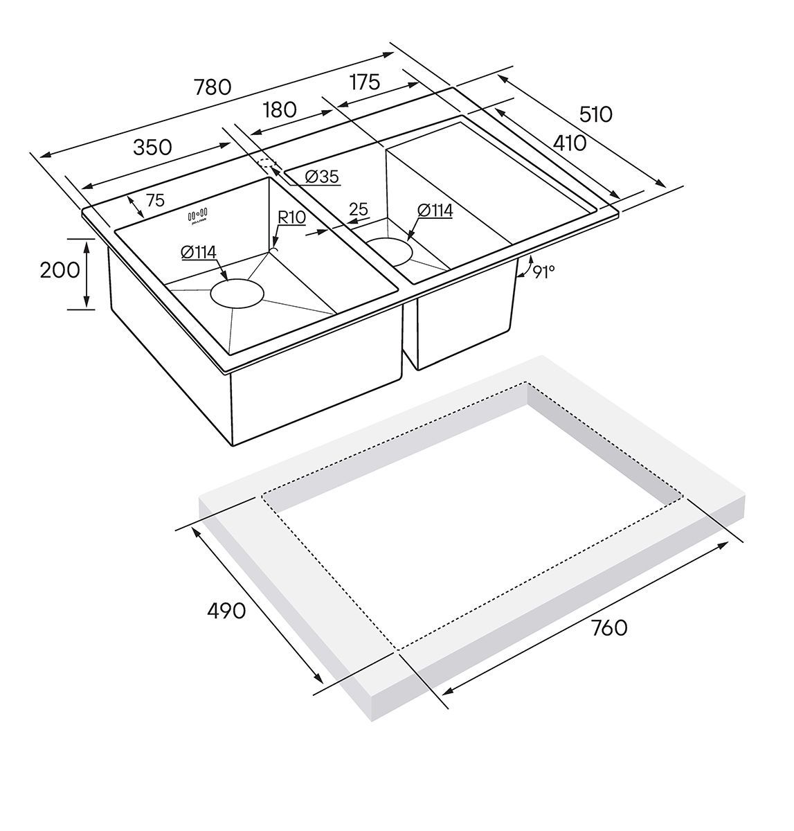 - Толщина мойки: 1,2 мм