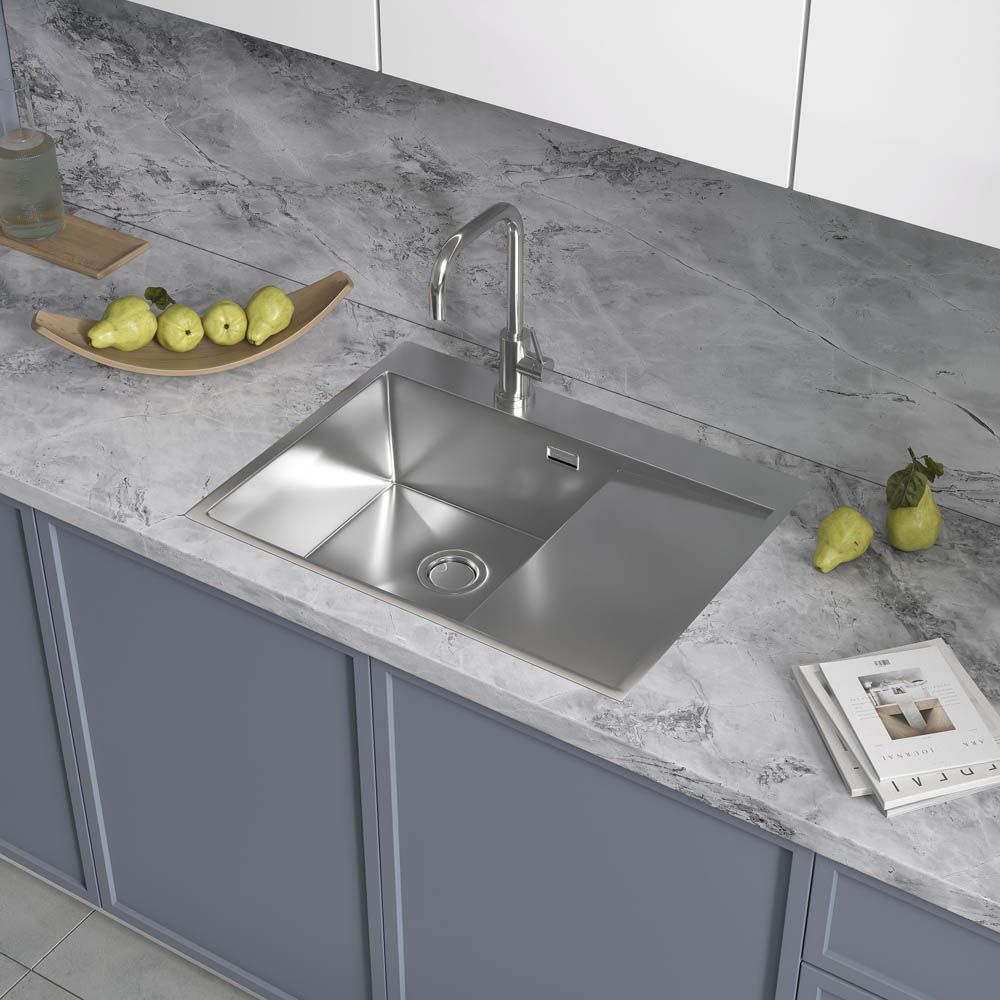 - Кухонные мойки: изготавливаются из нержавеющей стали AISI-304 или композитных материалов. Модели отличаются прочностью, функциональностью и разнообразием дизайнов — от классических до современных.