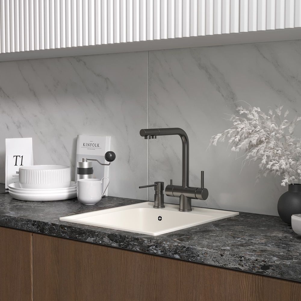 - Кухонные мойки: изготавливаются из нержавеющей стали AISI-304 или композитных материалов. Модели отличаются прочностью, функциональностью и разнообразием дизайнов — от классических до современных.