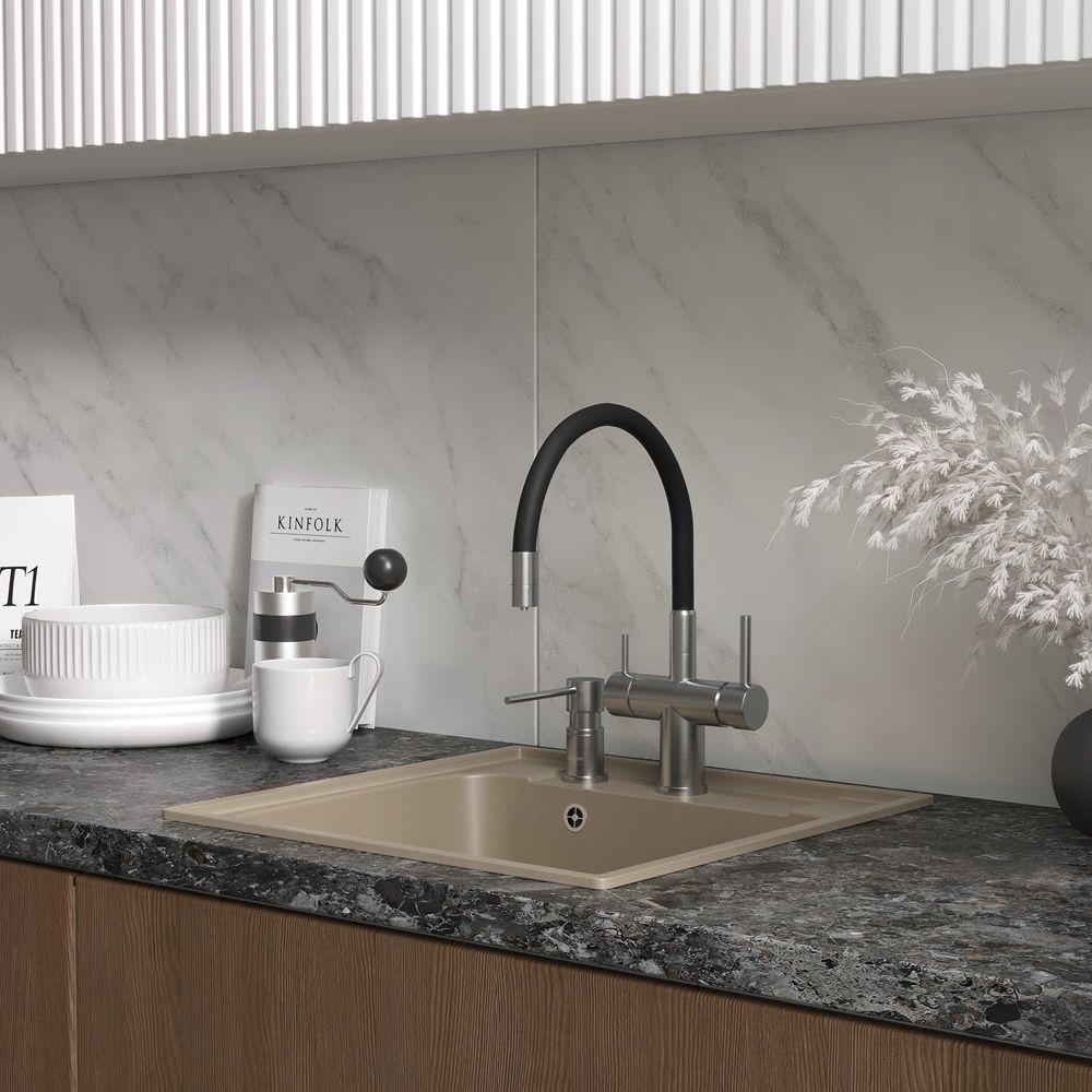 - Кухонные мойки: изготавливаются из нержавеющей стали AISI-304 или композитных материалов. Модели отличаются прочностью, функциональностью и разнообразием дизайнов — от классических до современных.