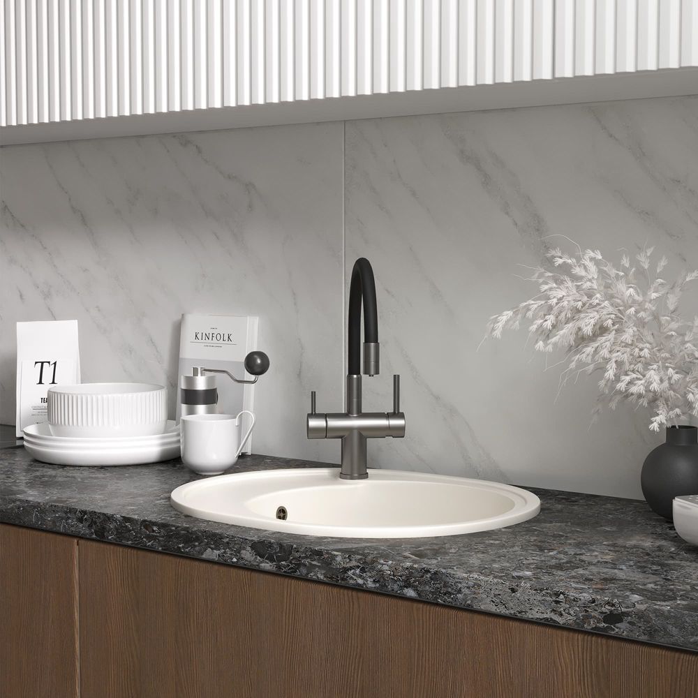 - Кухонные мойки: изготавливаются из нержавеющей стали AISI-304 или композитных материалов. Модели отличаются прочностью, функциональностью и разнообразием дизайнов — от классических до современных.