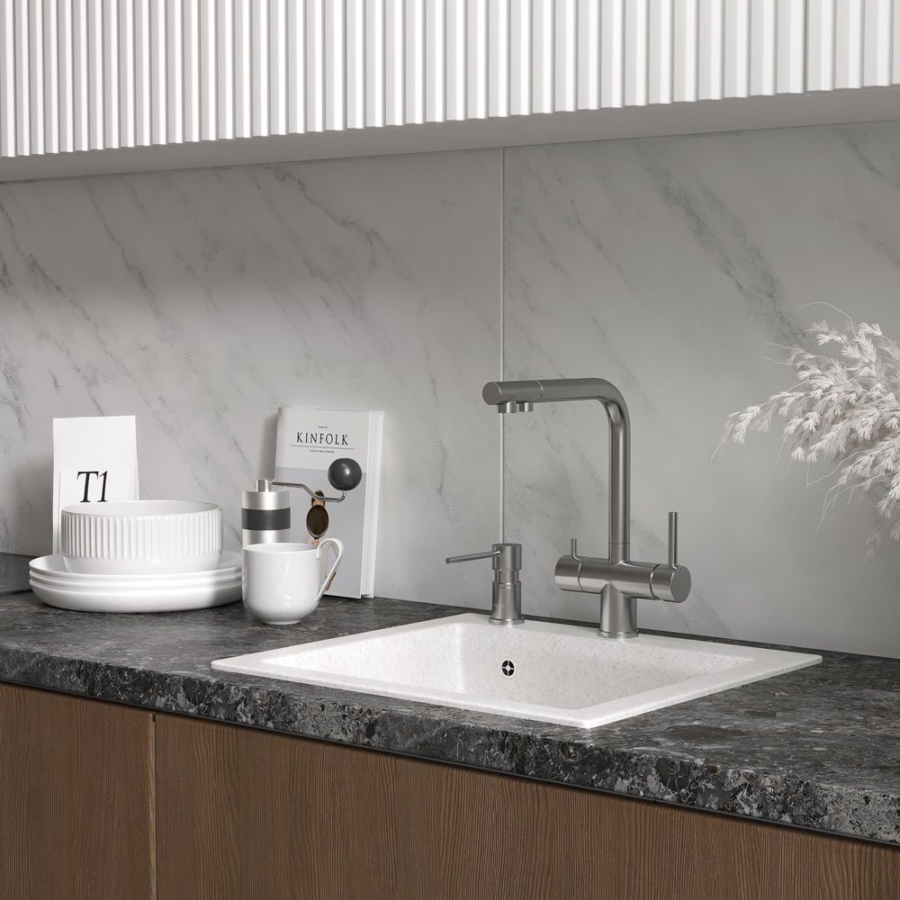 - Кухонные мойки: изготавливаются из нержавеющей стали AISI-304 или композитных материалов. Модели отличаются прочностью, функциональностью и разнообразием дизайнов — от классических до современных.