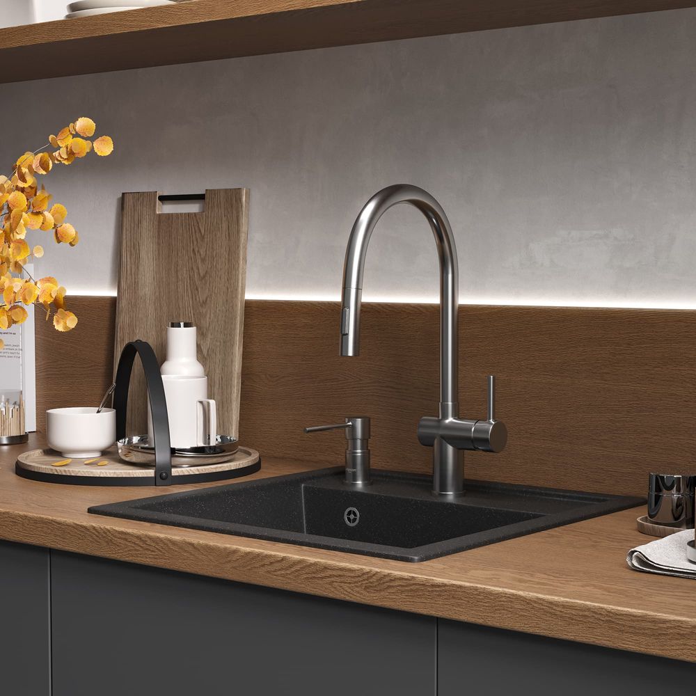 - Кухонные мойки: изготавливаются из нержавеющей стали AISI-304 или композитных материалов. Модели отличаются прочностью, функциональностью и разнообразием дизайнов — от классических до современных.