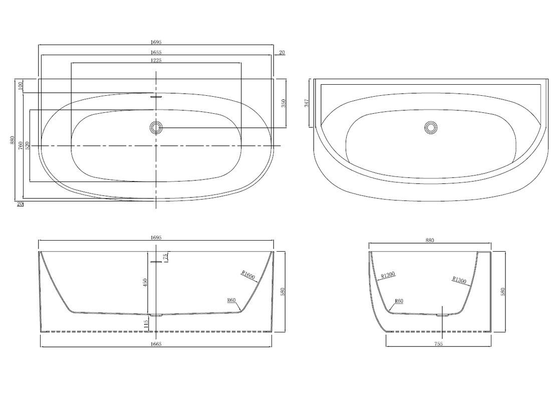 Ванна акриловая Azario CAMBRIDGE 1695х880х580, пристенная, в комплекте с сифоном и металлической рамой (CAM17289)