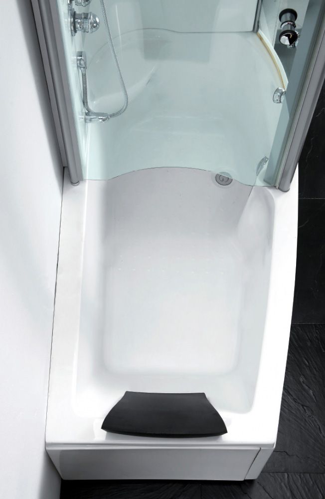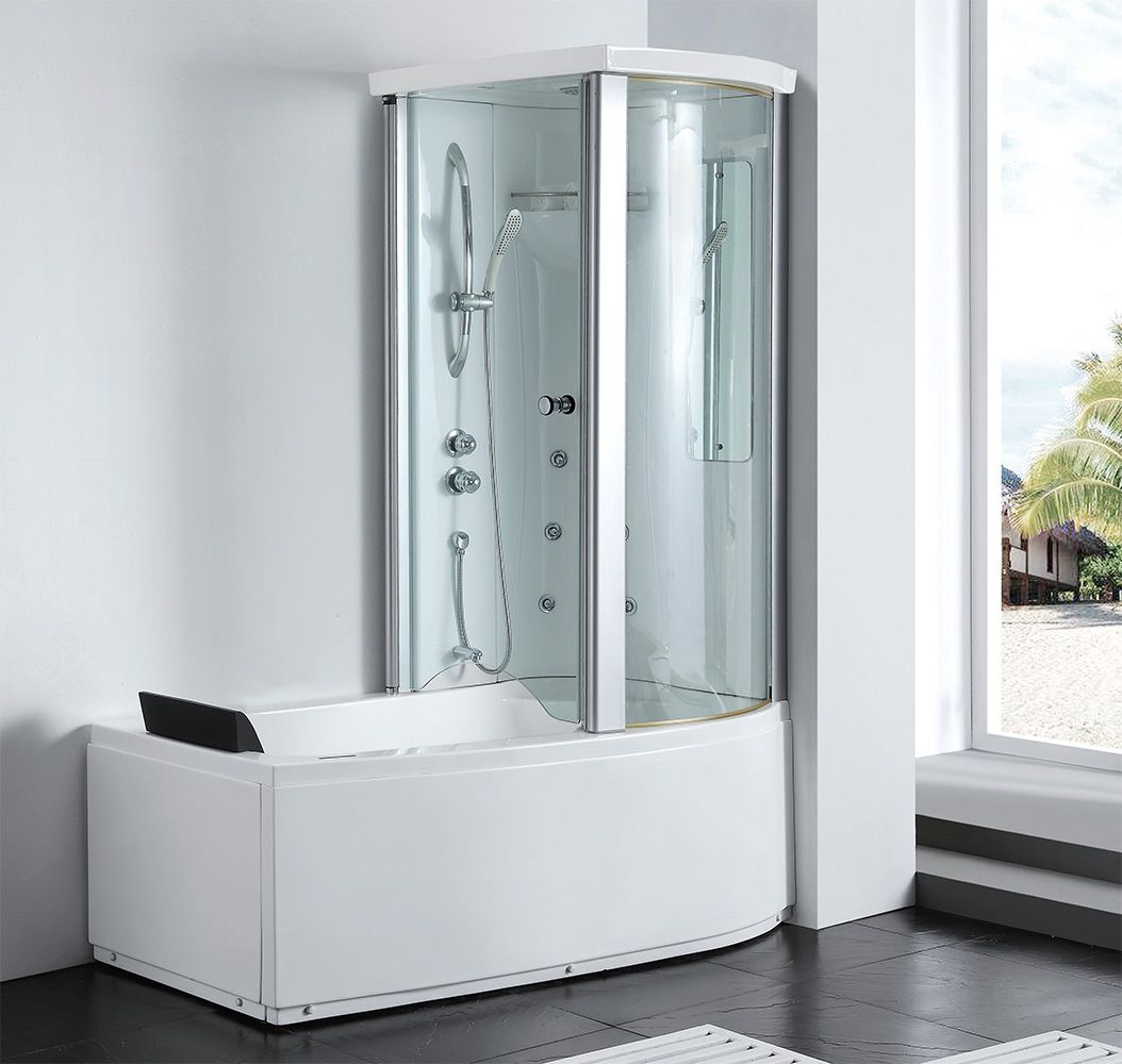 Комплектация: Вертикальный гидромассаж 6 форсунок, полочка, зеркало, смеситель с изливом, верхний душ, лейка;