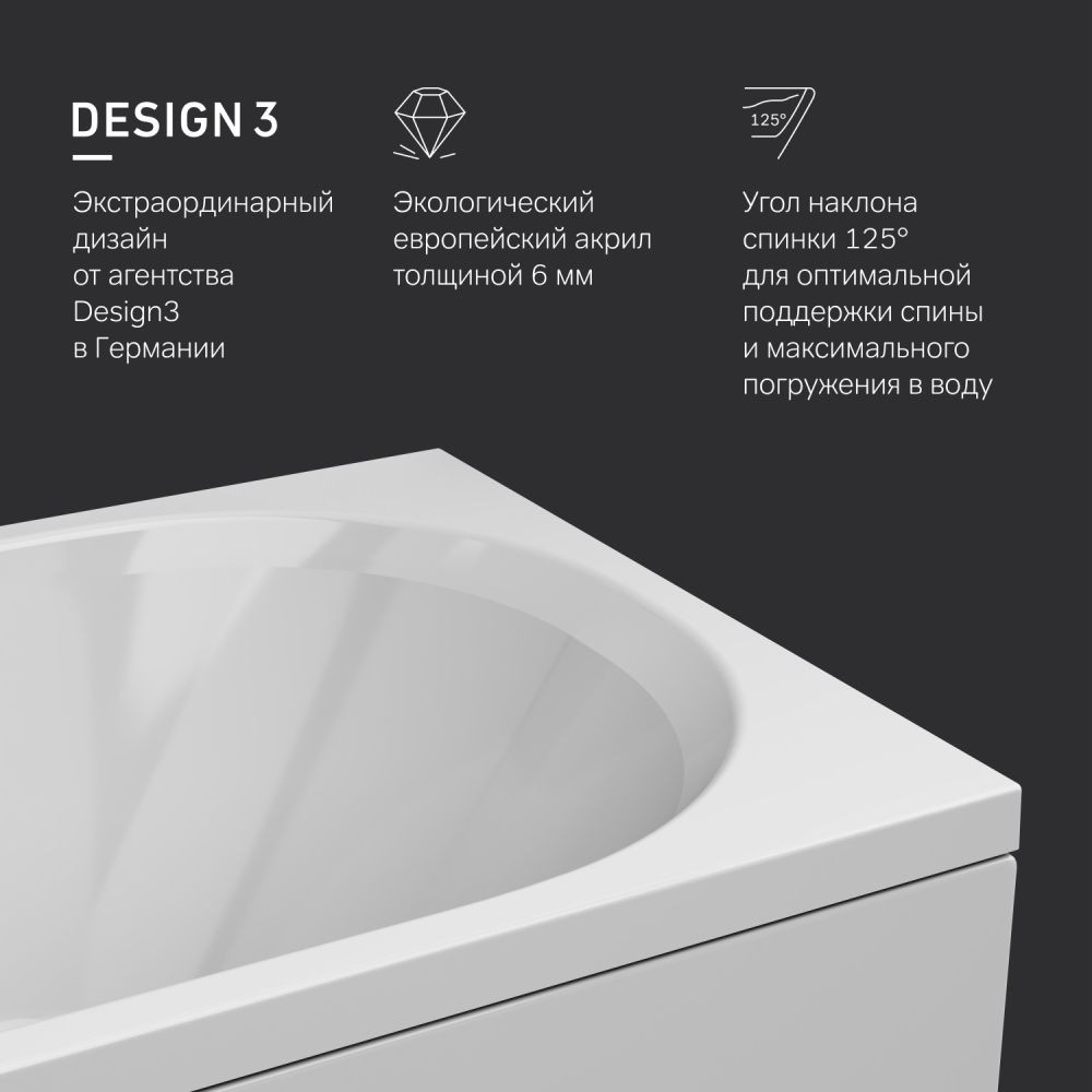Увеличенный внутренний объем при стандартных внешних габаритах благодаря ультратонким бортам делает процесс принятия ванны комфортным для человека любой комплекции. А универсальный дизайн подойдет как для современного так и для классического интерьера.