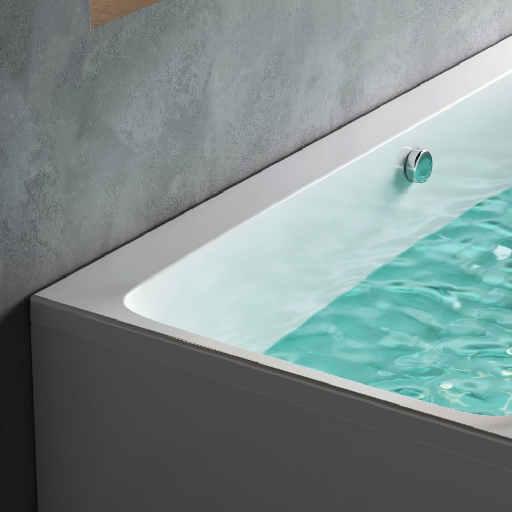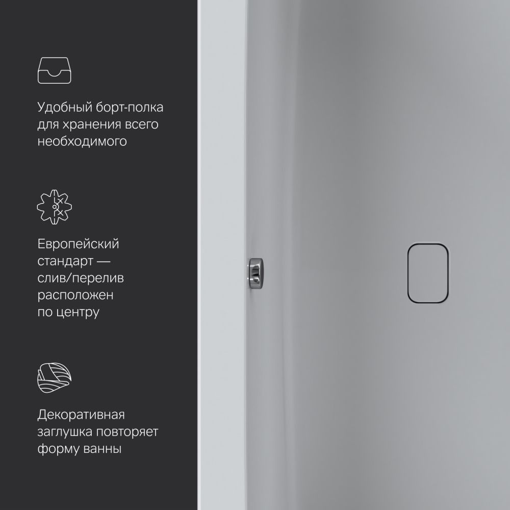 Характерный дизайн: сочетание широкого борта с одной стороны с ультра-тонким бортом с другой стороны создает неповторимую квинтэссенцию стиля. А декоративная заглушка слива повторяющая форму самой ванны станет яркой деталью в интерьере.