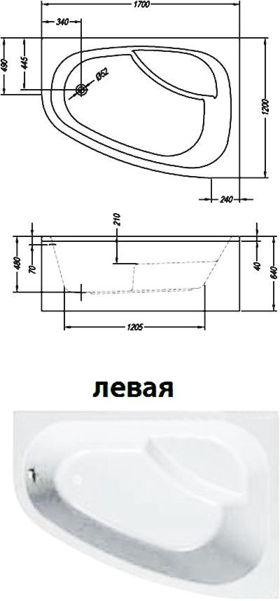 Свойства. Длина, см: 170; Ширина, см: 120; Глубина, см: 48; Высота с опорой, см: 64; Объем, л: 350; Монтаж: пристенная; Материал: акрил; Расположение перелива: стандартное; Диаметр слива ванны, см: 5.2; Для слива-перелива диаметром, см: 5.2; Область применения: бытовая / для пожилых людей / для детей; Количество человек: 2; Толщина листа, см: 0.45; Гарантия: 5 лет; Страна: Словения; Форма: асимметричная; Угловая конструкция: да; Ориентация: левая; Цвет: белый; Стиль дизайна: современный; Система гидромассажа: нет, установка не предусмотрена; Аэромассаж: нет, установка не предусмотрена; Подводная подсветка: нет, установка не предусмотрена; Хромотерапия: нет, установка не предусмотрена; Ароматерапия: нет, установка не предусмотрена; Озонирование: нет, установка не предусмотрена; Система дезинфекции: нет, установка не предусмотрена; Управление: нет; Каркас: есть, в комплекте; Ножки: нет, установка на ножки не предусмотрена; Ручки: есть, приобретаются отдельно; Слив-перелив: есть, в комплекте; Подголовник: нет, приобретается отдельно; Подлокотники: нет; Встроенное сиденье: есть; Антискользящее покрытие: нет.