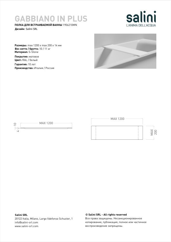 Полка GABBIANO IN PLUS изготавливается по индивидуальным размерам: максимальная длина изделия может достигать 1 200 мм, а длина — 200 мм. Чтобы подобрать оптимальный размер полки GABBIANO IN PLUS под чашу вашей ванны, свяжитесь с менеджером Salini.
