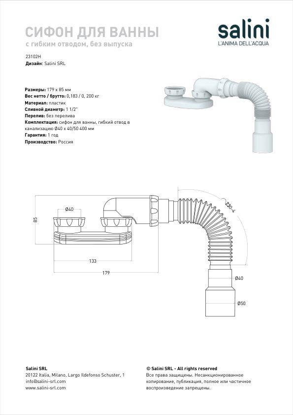- Комплектация: Cифон для ванны, гибкий отвод в канализацию