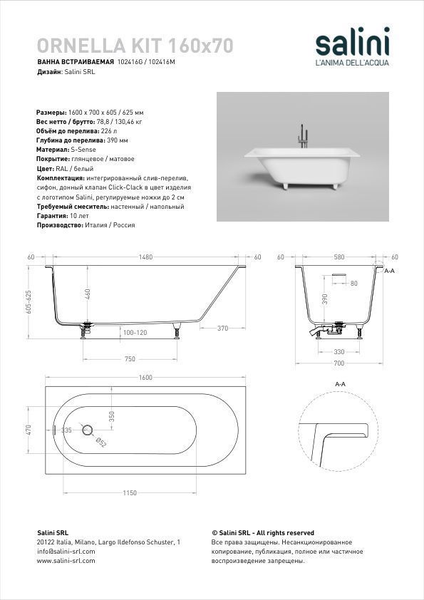 - Комплектация: ванна, регулируемые ножки до 2 см, интегрированный слив перелив, донный клапан цвет белый