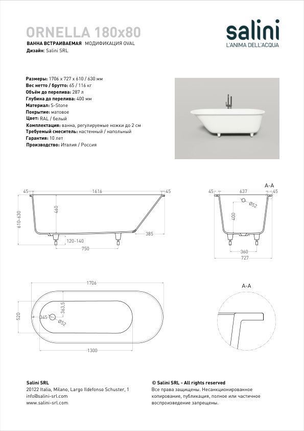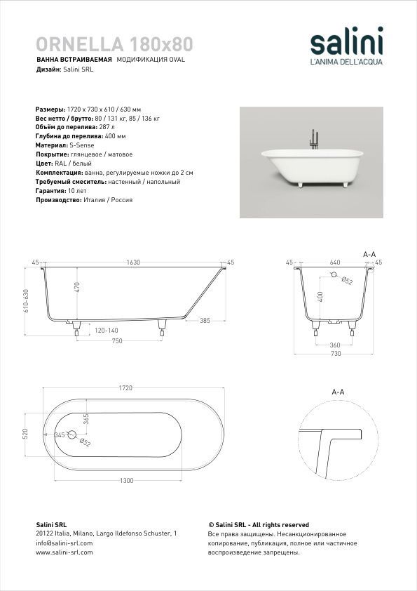 Встраиваемая ванна с отверстиями для слива и для перелива. Классические линии и универсальная форма дополнят интерьер вашей ванной комнаты. С учётом качества поверхности и эргономичности формы ванны ORNELLA по праву считаются одними из самых комфортных.