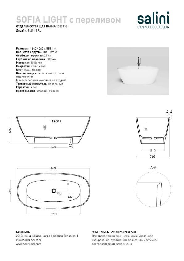 При габаритах 165х75 см SOFIA LIGHT будет идеальным вариантом как для больших, так и для маленьких ванных комнат, где одинаково важны чистые линии и повседневная практичность. Эта модель идеально подойдёт как для расположения у стены, так и для размещения в центре комнаты.