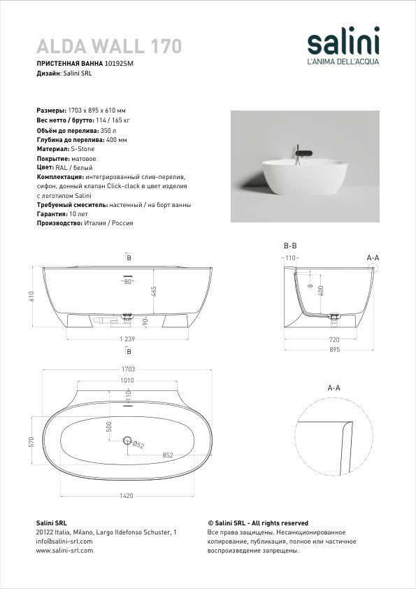 Эта модель соединяет в себе классическую овальную форму изголовий и спрятанный за ними пристенный борт. Благодаря такой конструкции создаётся впечатление отдельностоящей ванны, но сохраняется практичность плотного примыкания к стене и дополнительной поверхности для хранения косметических средств и аксессуаров. При желании здесь также можно разместить и смеситель. Более тонкая, детальная проработка формы чаши позволила уйти от классического понимания пристенной ванны с массивной боковой проекцией: блок, соприкасающийся со стеной, будто утоплен вдоль задней поверхности. Такова новая эстетика облегчённого дизайнерского решения Salini.